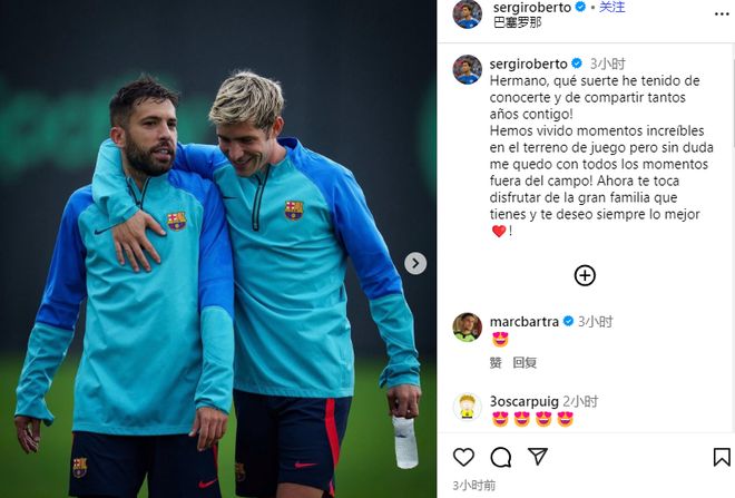 雷速体育10月8日讯 前巴塞罗那球星罗伯托,在昔日队友阿尔巴接受职业生涯后,也在社媒发文对他进行告别。